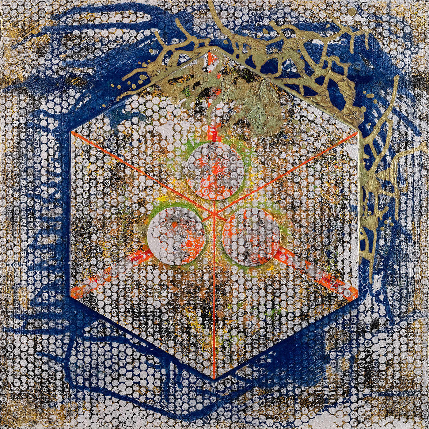 Eléments 11, acrylique, sable, bois et pigments métalliques sur toile, 40x40 cm.